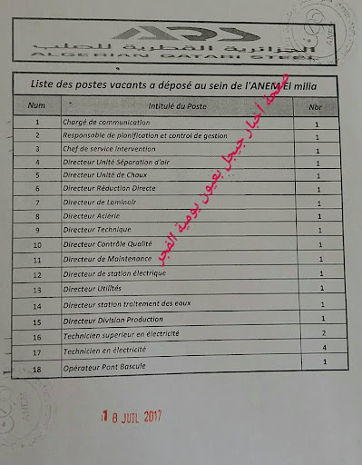 إعلان توظيف في الجزائرية القطرية للصلب جيجل جويلية 2017